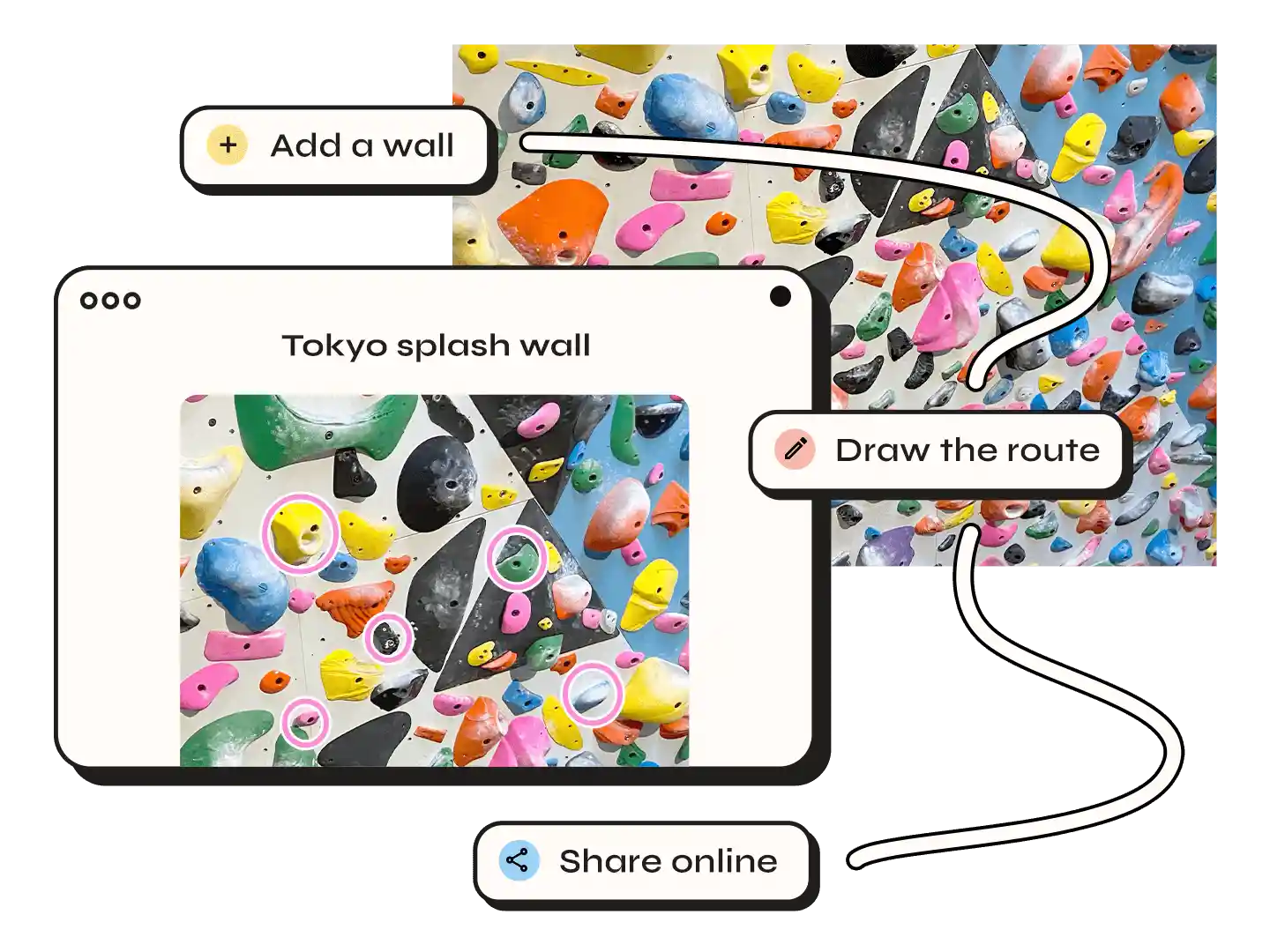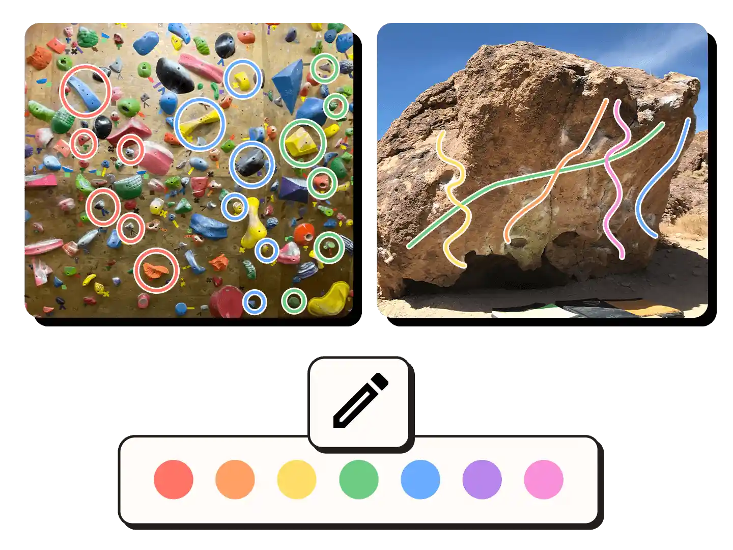 Upload a photo. Draw the route with our color tool. Add grade and name. Your crag now has guidebook-quality visual topos.