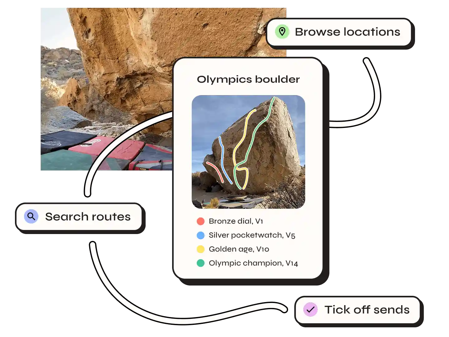 Visual route maps at the boulder. GPS discovery, guidebook detail, always up-to-date, always in your pocket.